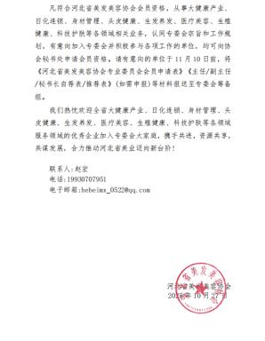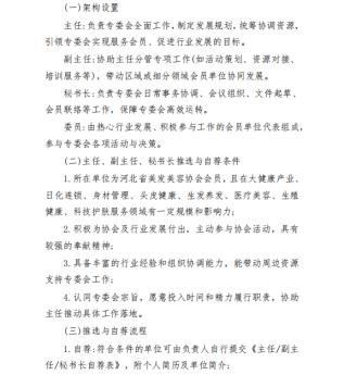 为进一步推动河北省大健康产业、日化连锁、身材管理、头皮健康、生发养发、医疗美容、生殖健康、科技护肤服务行业规范化、专业化、品牌化发展,凝聚行业力量,整合优质资源,搭建高效交流与合作平台,河北省美发美容协会现面向全省大健康产业、日化连锁、身材管理、头皮健康、生发养发、医疗美容、生殖健康、科技护肤等领域相关单位公开征集专业委员会会员。